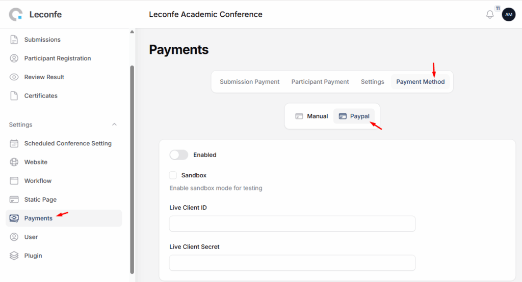 Go to the Payment menu and open the Payment Method → PayPal tab. Enable the PayPal payment method and enter the Client ID and Secret ID that you obtained in the previous steps.