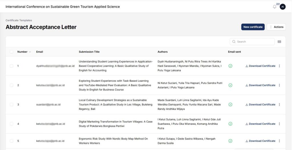 We made these changes and updated Leconfe based on their suggestions. The conference went very well without any major problems. Although Leconfe has a feature for publishing proceedings, PNB preferred to send their accepted papers directly to Atlantis Press.